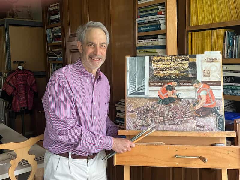 Doochin paints what he knows. His realist works show laborers mid-motion, fields alive with human rhythm, marketplaces in harmony and tension. Each subject is someone he met. Each moment, something he lived.