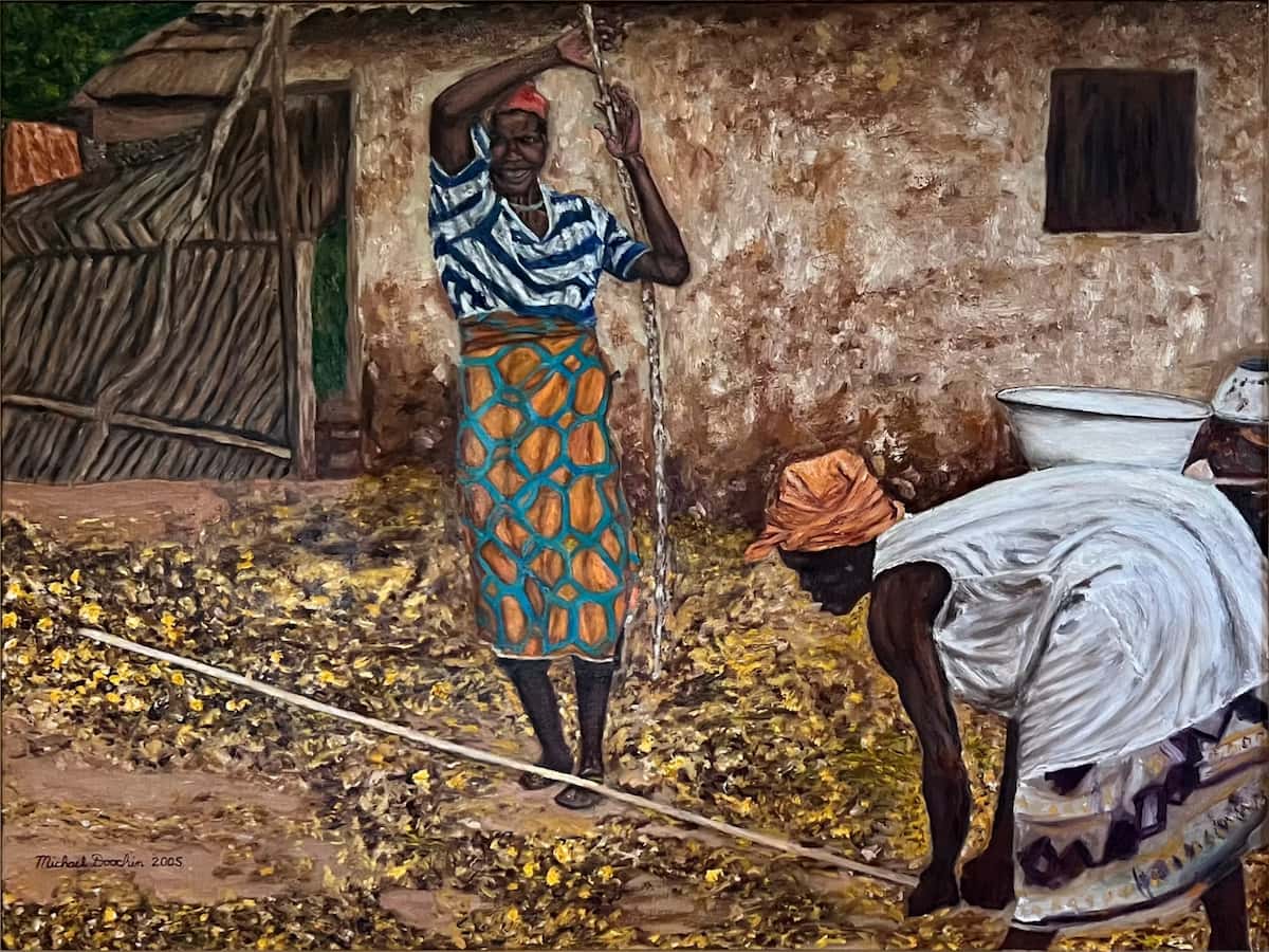 In Threshing the Millet, two West African women work in tandem, their bodies synchronized not just by necessity, but by something sacred. “They were singing,” he recalls. “Working in rhythm with the land. That kind of presence, that’s what I want to offer.”
